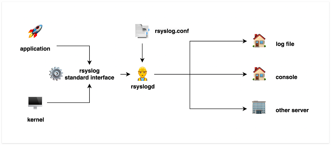 rsyslogd라는 데몬 프로세스를 통해 작업이 이루어지며, 이 과정에서 rsyslog.conf 설정 파일을 참조합니다.