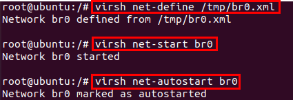 | virsh net-define /tmp/br0.xml virsh net-start br0 virsh net-autostart br0 |