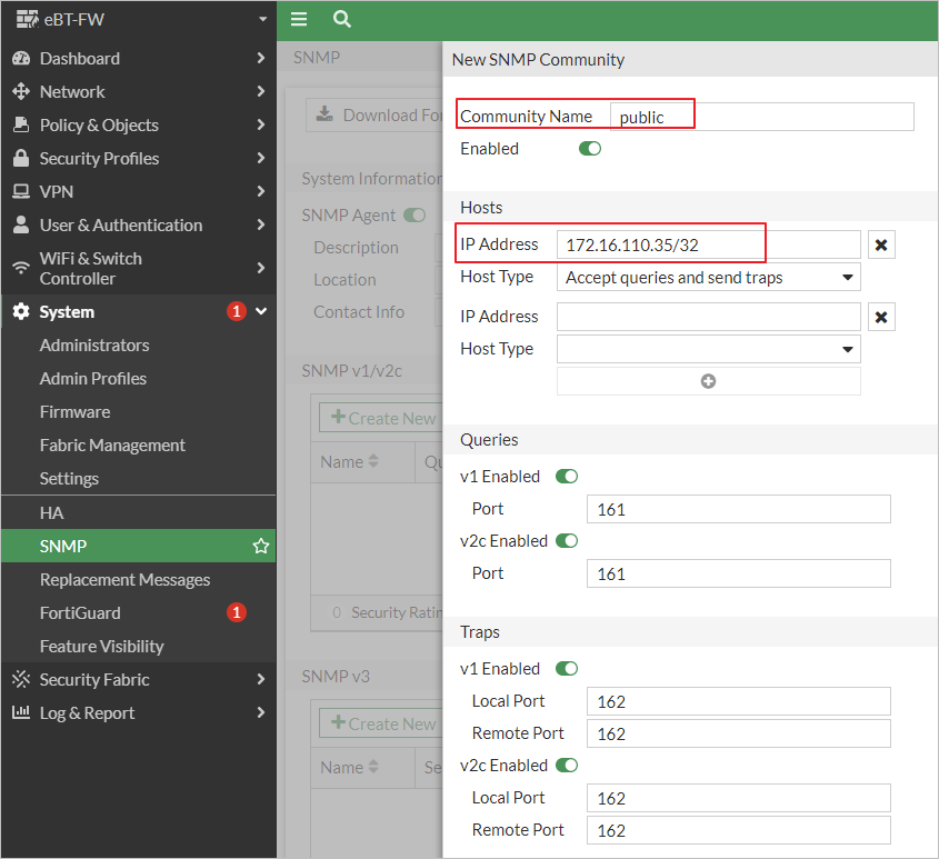 만약 FortiGate 관리자에 Trusthost가 설정되어 있다면, SNMP Manager에 대해서 TrustHost에 추가해야 한다.