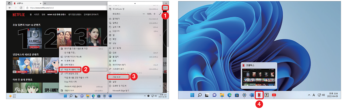 외국어 학습자 또는 인스타그램, 페이스북 같은 SNS를 상시 활용하는 사용자에게 유용한 엣지 표시줄 기능입니다. 엣지 브라우저의 우측 상단에 있는 [설정 및 기타]를 눌러 [기타 도구]에 들어간 뒤 [Edge 표시줄 시작]을 클릭합니다. 엣지 표시줄 사용하면 카카오톡이나 라인 같은 메신저처럼 항상 화면의 우측에 웹 브라우저가 표시됩니다.