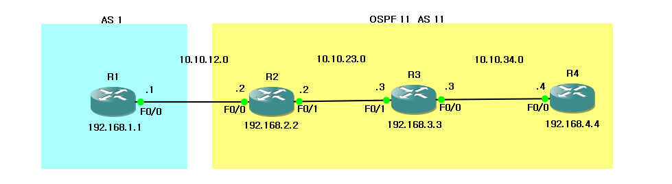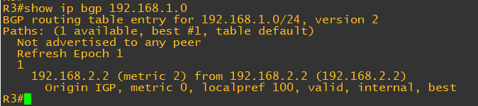 R3에서는 192.168.1.0/24의 경로가 BGP를 통해서 보일 것이며 R4에서는 보이지 않을 것이다.