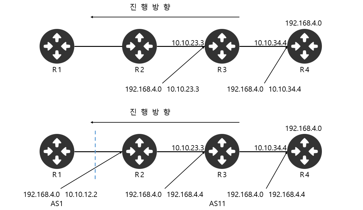 BGP는 광고받은 네트워크의 넥스트 홉 주소가 라우팅 가능한 것이어야만 해당 네트워크를 사용할 수 있다. 예를 들어, R2, R3, R4에서 AS 1에 속한 192.168.1.0/24 네트워크의 넥스트 홉은 기본적으로 AS 1과 AS 11를 연결하는 라우터인 R1의 인터페이스 주소인 10.10.12.1이 된다.