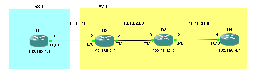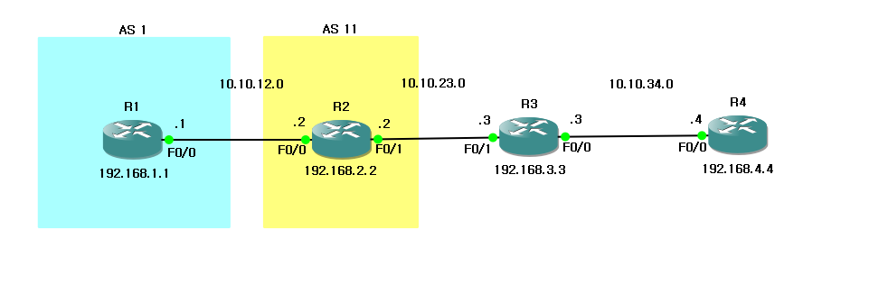 따라서, AS 11에 속한 각 라우터에서 192.168.1.0/24 네트워크를 사용하려면 넥스트 홉 주소가 포함된 DMZ인 10.10.12.0 네트워크로 라우팅이 가능해야 한다.