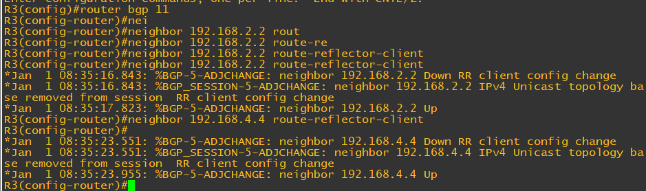 해당 토폴로지에서 R3를 루트리플렉터 라우터로 설정을 하면 R2에게서 얻은 정보를 R4로 전달할 것이다.