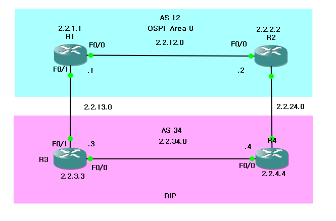 **참고로 기존과 다르게 R3, R4에 중복으로 2.2.3.0/24, 2.2.4.0/24 네트워크를 중복하여 BGP에 포함시켰다.