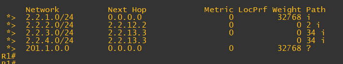 그림과 같이 R4에서 BGP 테이블을 확인해 보면 201.1.0.0/22 네트워크의 AS 경로에 축약되기 전의 상세 네트워크가 통과해 온 AS 번호들이 순서없이 기록되어 있다. AS 세트는 괄호안에 표시된다.