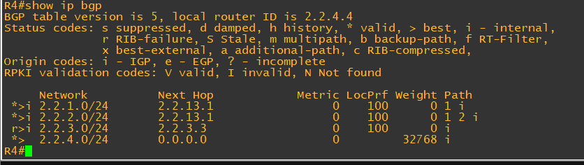 - BGP 설정도 마쳤으며 라우팅 테이블은 예시로 R4를 아래에 첨부한다.
