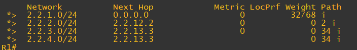 2. AS 34의 R4가 2.2.3.0 네트워크에 대한 라우팅 정보를 eBGP 라우터인 R2에게 전송할 때, 별도의 수정이 없는 경우 R4에서 2.2.3.0/24 네트워크의 메트릭 값이 1 이니 MED 값 역시 1로 설정하여 전송한다.