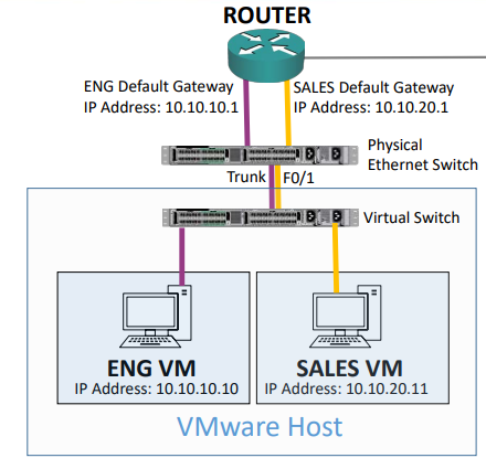 **일반적인 데스크탑 PC와 같은 종단 호스트들은 통상적으로 하나의 VLAN에 속해 있고 VLAN을 인식할 수 없다. 따라서 그런 호스트들에 대해서는 액세스 포트로 구성된다. 그러나 VMware나 Hyper V 같은 가상 호스트는 특별한 종류의 종단 호스트로 호스트의 서로 다른 IP 서브넷에 속한 가상 머신들은 트렁크 포트로 설정해야한다. (아래 그림 참조)
