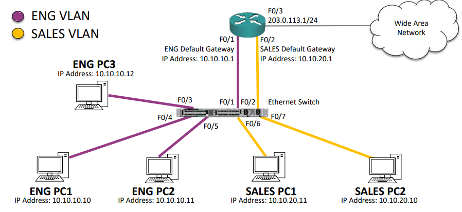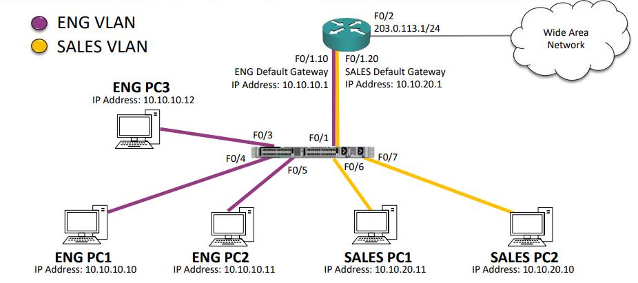 각 VLAN 상의 기본 게이트웨이로서 작동하는 개별 인터페이스를 가진 라우터를 사용하는 방법 (아래 그림 참조)