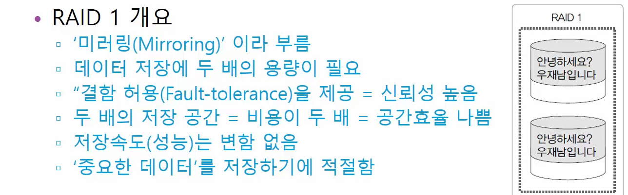 - 고가의 하드웨어 RAID의 대안으로 운영체제에서 지원하는 방식이다.