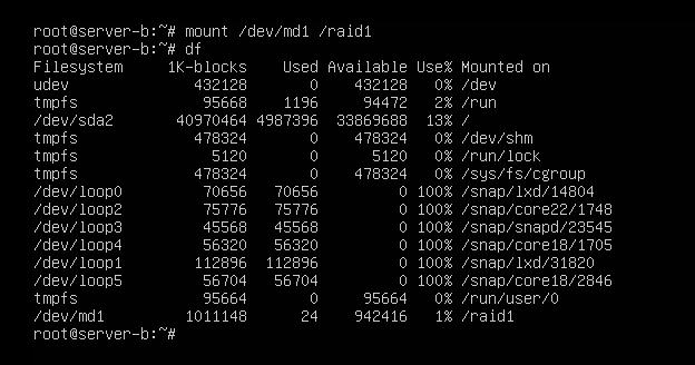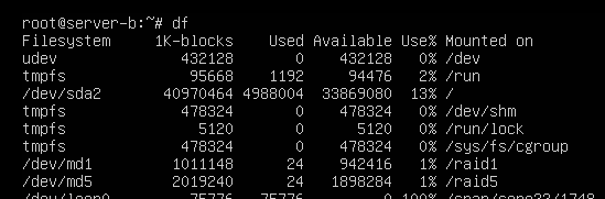 리부팅 후 df 명령어로 확인시 RAID 1과 5는 구동을 하고 있는것으로 확인 된다.