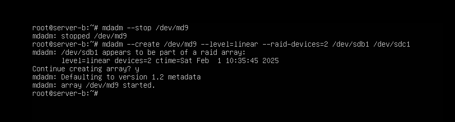 | mdadm | -- create | /dev/md9 | --level=linear | --raid-devices=2 | /dev/sdb1 /dev/sdc1 |