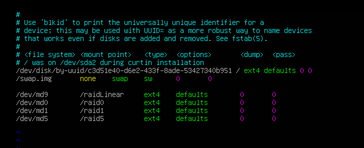 다른 방식의 레이드는 레벨, 장비수가 다른 것 외에는 동일하여 따로 다 진행하였고 아래와 같이 /etc/fstab 파일에 추가 하였다.