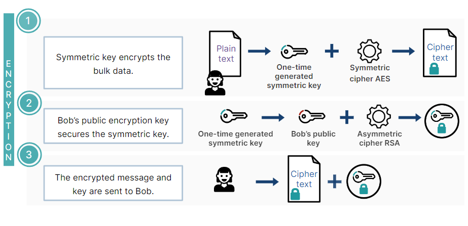 암호화 프로세스 중에 보낸 사람의 암호화 애플리케이션은 받는 사람의 비대칭 공개 키와 비대칭 암호를 사용하여 일반 텍스트 데이터를 암호 텍스트로 변환합니다.
