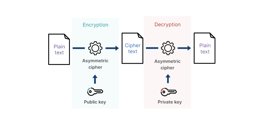암호 해독 프로세스 중에 수신자의 암호화 애플리케이션은 개인 암호 해독 키와 보낸 사람이 사용한 것과 동일한 비대칭 암호를 사용하여 암호 텍스트를 일반 텍스트로 변환합니다.