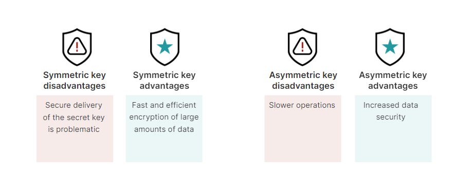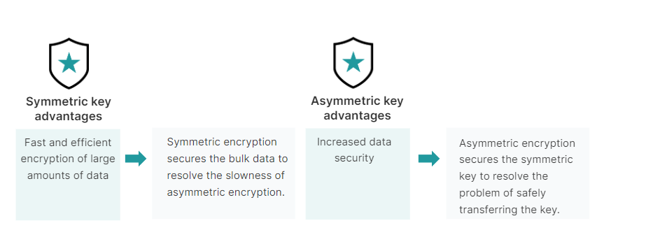 대칭 암호화의 주요 단점은 수신자에게 키를 안전하게 전달한다는 점이며, 비대칭 암호화의 주요 단점은 속도가 느리다는 점입니다. 대칭 암호화와 비대칭 암호화를 결합하면 두 암호화 방식의 단점이 해결됩니다.