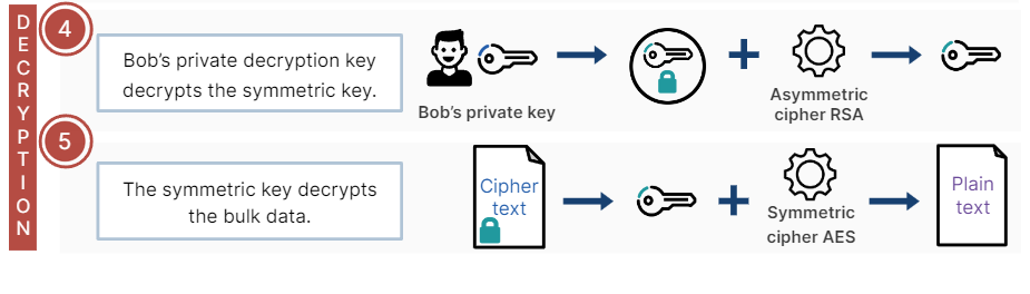 암호 해독의 첫 번째 단계에서 Bob의 암호화 애플리케이션은 Bob의 보안 키 저장소에서 개인 키를 검색합니다. 이 단계에서 Bob은 자격 증명을 제출해야 할 수도 있습니다. 개인 암호 해독 키는 Alice가 사용한 동일한 비대칭 알고리즘과 함께 대칭 키를 해독합니다.