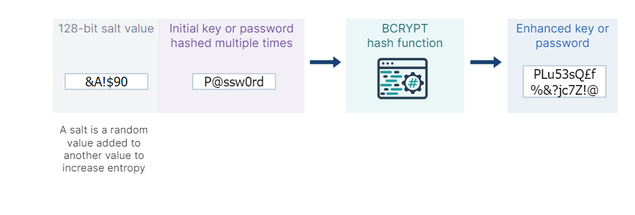 BCRYPT는 OpenBSD 및 다양한 Linux 배포판에서 키 확장에 사용되는 기본 알고리즘입니다. BCRYPT를 사용하면 128 비트의 솔트값이 추가되기 전에 키나 암호가 여러 번 해시됩니다. 그런 다음 결합된 값이 다시 한 번 해시됩니다.