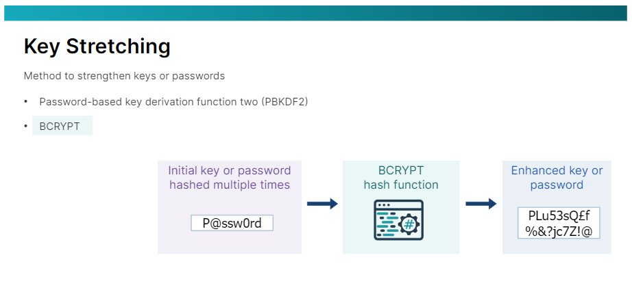 키 스트레칭은 너무 짧거나 예측 가능한 키나 비밀번호를 강화하는 데 사용되는 방법입니다. 이 프로세스에는 키나 비밀번호를 해싱 알고리즘에 입력하여 향상된 키나 비밀번호를 생성하는 작업이 포함됩니다. 확장 알고리즘의 예로는 비밀번호 기반 키 파생 함수 2(PBKDF2) 및 BCRYPT1이 있습니다.