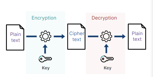 대칭 암호화를 사용하여 정보를 암호화하기 위해 암호화 애플리케이션은 대칭 키와 암호를 사용하여 일반 텍스트를 암호 텍스트로 변환합니다.