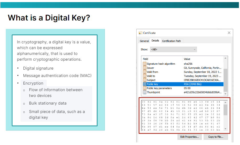 디지털 키는 두 장치 간의 정보 흐름, 대용량 고정 데이터 또는 데이터 조각을 암호화하는 데 사용됩니다. 또한 키가 수행하는 작업에 따라 수명은 바뀔 수가 있습니다. 예를 들어, 인증서 서명에 사용되는 키는 10년 이상 유효할 수 있지만 두 장치 간의 세션을 암호화하는 데 사용되는 키는 해당 세션 기간 동안에만 사용됩니다. 키는 일반적으로 비공개 또는 비밀로 유지되지만 공개될 수도 있습니다. 공개 키는 종종 디지털 인증서에 기록됩니다.